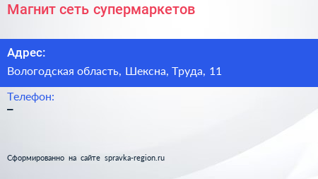Магнит, сеть супермаркетов по адресу Вологодская область, Шексна, Труда, 11 в дальнейшем Организация, размещена в следующих категориях: