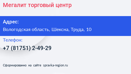 Мегалит, торговый центр по адресу Вологодская область, Шексна, Труда, 10 в дальнейшем Организация, размещена в следующих категориях: