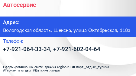 Автосервис по адресу Вологодская область, Шексна, улица Октябрьская, 118а в дальнейшем Организация, размещена в следующих категориях: