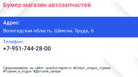 Бумер, магазин автозапчастей по адресу Вологодская область, Шексна, Труда, 6 в дальнейшем Организация, размещена в следующих категориях:
