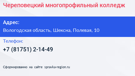 Череповецкий многопрофильный колледж по адресу Вологодская область, Шексна, Полевая, 10 в дальнейшем Организация, размещена в следующих категориях: