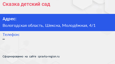 Сказка, детский сад по адресу Вологодская область, Шексна, Молодёжная, 4/1 в дальнейшем Организация, размещена в следующих категориях: