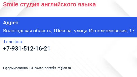 Smile, студия английского языка по адресу Вологодская область, Шексна, улица Исполкомовская, 17 в дальнейшем Организация, размещена в следующих категориях: