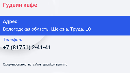 Гудвин, кафе по адресу Вологодская область, Шексна, Труда, 10 в дальнейшем Организация, размещена в следующих категориях: