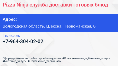 Pizza Ninja, служба доставки готовых блюд по адресу Вологодская область, Шексна, Первомайская, 8 в дальнейшем Организация, размещена в следующих категориях: