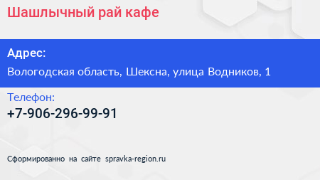 Шашлычный рай, кафе по адресу Вологодская область, Шексна, улица Водников, 1 в дальнейшем Организация, размещена в следующих категориях: