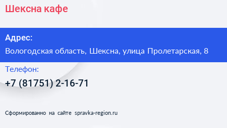 Шексна, кафе по адресу Вологодская область, Шексна, улица Пролетарская, 8 в дальнейшем Организация, размещена в следующих категориях: