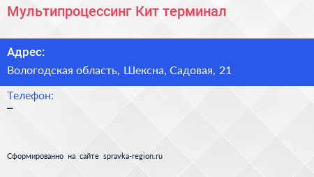 Мультипроцессинг Кит, терминал по адресу Вологодская область, Шексна, Садовая, 21 в дальнейшем Организация, размещена в следующих категориях: