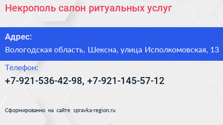 Некрополь, салон ритуальных услуг по адресу Вологодская область, Шексна, улица Исполкомовская, 13 в дальнейшем Организация, размещена в следующих категориях: