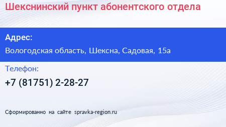 Шекснинский пункт абонентского отдела по адресу Вологодская область, Шексна, Садовая, 15а в дальнейшем Организация, размещена в следующих категориях: