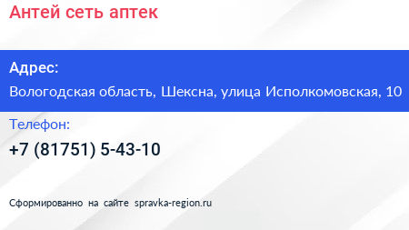 Антей, сеть аптек по адресу Вологодская область, Шексна, улица Исполкомовская, 10 в дальнейшем Организация, размещена в следующих категориях: