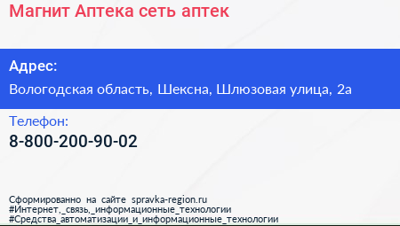 Магнит Аптека, сеть аптек по адресу Вологодская область, Шексна, Шлюзовая улица, 2а в дальнейшем Организация, размещена в следующих категориях: