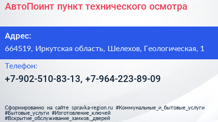 АвтоПоинт, пункт технического осмотра по адресу 664519, Иркутская область, Шелехов, Геологическая, 1 в дальнейшем Организация, размещена в следующих категориях: