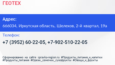 ГЕОТЕХ по адресу 666034, Иркутская область, Шелехов, 2-й квартал, 19а в дальнейшем Организация, размещена в следующих категориях: