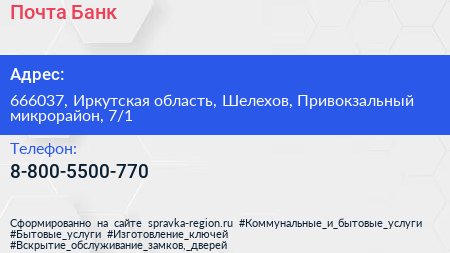 Почта Банк по адресу 666037, Иркутская область, Шелехов, Привокзальный микрорайон, 7/1 в дальнейшем Организация, размещена в следующих категориях: