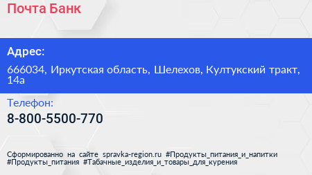Почта Банк по адресу 666034, Иркутская область, Шелехов, Култукский тракт, 14а в дальнейшем Организация, размещена в следующих категориях: