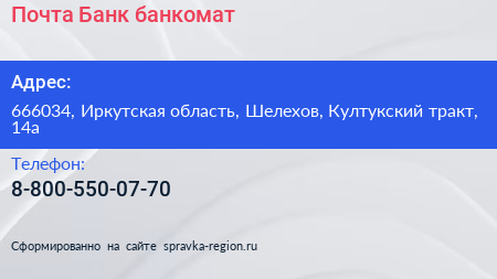 Почта Банк, банкомат по адресу 666034, Иркутская область, Шелехов, Култукский тракт, 14а в дальнейшем Организация, размещена в следующих категориях: