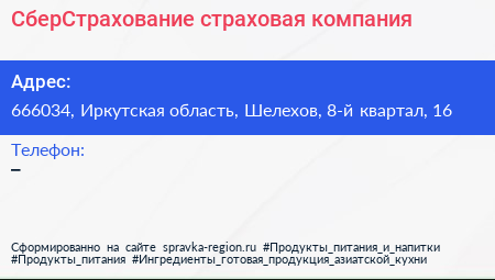 СберСтрахование, страховая компания по адресу 666034, Иркутская область, Шелехов, 8-й квартал, 16 в дальнейшем Организация, размещена в следующих категориях: