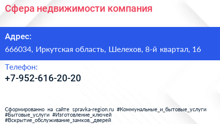 Сфера недвижимости, компания по адресу 666034, Иркутская область, Шелехов, 8-й квартал, 16 в дальнейшем Организация, размещена в следующих категориях: