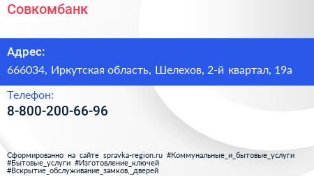 Совкомбанк по адресу 666034, Иркутская область, Шелехов, 2-й квартал, 19а в дальнейшем Организация, размещена в следующих категориях: