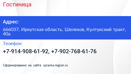 Гостиница по адресу 666037, Иркутская область, Шелехов, Култукский тракт, 40а в дальнейшем Организация, размещена в следующих категориях: