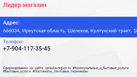 Лидер, магазин по адресу 666034, Иркутская область, Шелехов, Култукский тракт, 18 в дальнейшем Организация, размещена в следующих категориях: