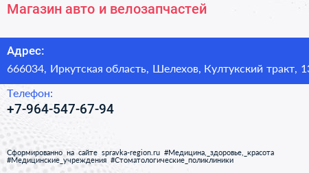 Магазин авто и велозапчастей по адресу 666034, Иркутская область, Шелехов, Култукский тракт, 13 в дальнейшем Организация, размещена в следующих категориях: