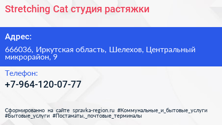 Stretching Cat, студия растяжки по адресу 666036, Иркутская область, Шелехов, Центральный микрорайон, 9 в дальнейшем Организация, размещена в следующих категориях: