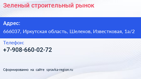 Зеленый, строительный рынок по адресу 666037, Иркутская область, Шелехов, Известковая, 1а/2 в дальнейшем Организация, размещена в следующих категориях: