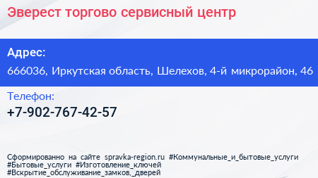 Эверест, торгово-сервисный центр по адресу 666036, Иркутская область, Шелехов, 4-й микрорайон, 46 в дальнейшем Организация, размещена в следующих категориях: