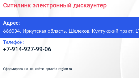 Ситилинк, электронный дискаунтер по адресу 666034, Иркутская область, Шелехов, Култукский тракт, 17 в дальнейшем Организация, размещена в следующих категориях: