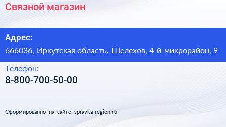 Связной, магазин по адресу 666036, Иркутская область, Шелехов, 4-й микрорайон, 9 в дальнейшем Организация, размещена в следующих категориях: