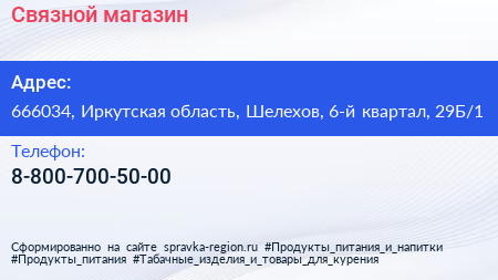 Связной, магазин по адресу 666034, Иркутская область, Шелехов, 6-й квартал, 29Б/1 в дальнейшем Организация, размещена в следующих категориях: