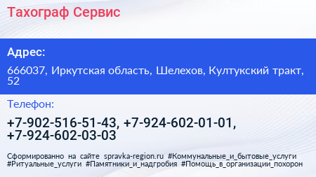 Тахограф-Сервис по адресу 666037, Иркутская область, Шелехов, Култукский тракт, 52 в дальнейшем Организация, размещена в следующих категориях: