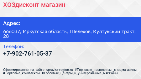 ХОЗдисконт, магазин по адресу 666037, Иркутская область, Шелехов, Култукский тракт, 28 в дальнейшем Организация, размещена в следующих категориях: