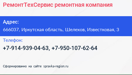 РемонтТехСервис, ремонтная компания по адресу 666037, Иркутская область, Шелехов, Известковая, 3 в дальнейшем Организация, размещена в следующих категориях: