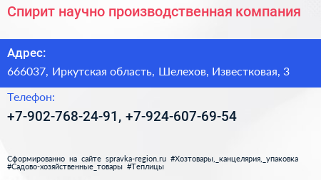 Спирит, научно-производственная компания по адресу 666037, Иркутская область, Шелехов, Известковая, 3 в дальнейшем Организация, размещена в следующих категориях: