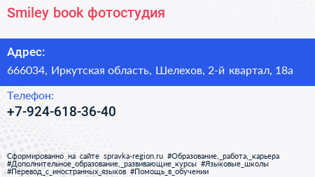 Smiley book, фотостудия по адресу 666034, Иркутская область, Шелехов, 2-й квартал, 18а в дальнейшем Организация, размещена в следующих категориях: