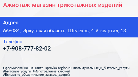 Ажиотаж, магазин трикотажных изделий по адресу 666034, Иркутская область, Шелехов, 4-й квартал, 13 в дальнейшем Организация, размещена в следующих категориях: