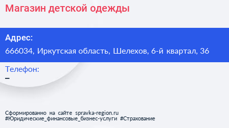 Магазин детской одежды по адресу 666034, Иркутская область, Шелехов, 6-й квартал, 36 в дальнейшем Организация, размещена в следующих категориях:
