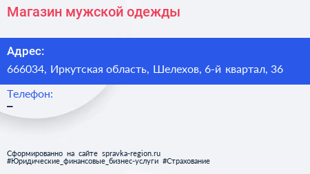 Магазин мужской одежды по адресу 666034, Иркутская область, Шелехов, 6-й квартал, 36 в дальнейшем Организация, размещена в следующих категориях: