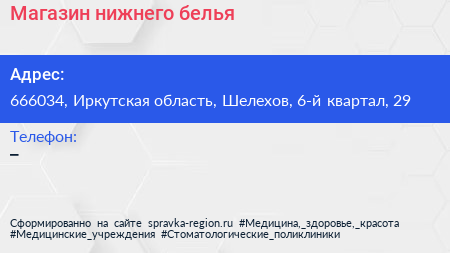 Магазин нижнего белья по адресу 666034, Иркутская область, Шелехов, 6-й квартал, 29 в дальнейшем Организация, размещена в следующих категориях: