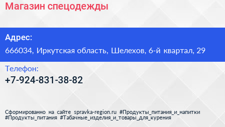 Магазин спецодежды по адресу 666034, Иркутская область, Шелехов, 6-й квартал, 29 в дальнейшем Организация, размещена в следующих категориях: