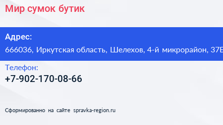 Мир сумок, бутик по адресу 666036, Иркутская область, Шелехов, 4-й микрорайон, 37Б в дальнейшем Организация, размещена в следующих категориях: