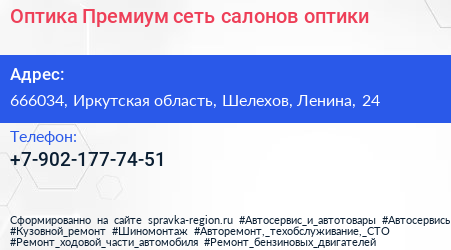 Оптика Премиум, сеть салонов оптики по адресу 666034, Иркутская область, Шелехов, Ленина, 24 в дальнейшем Организация, размещена в следующих категориях: