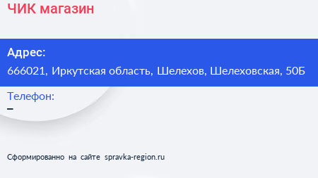 ЧИК, магазин по адресу 666021, Иркутская область, Шелехов, Шелеховская, 50Б в дальнейшем Организация, размещена в следующих категориях: