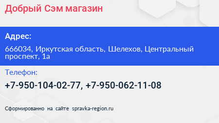 Добрый Сэм, магазин по адресу 666034, Иркутская область, Шелехов, Центральный проспект, 1а в дальнейшем Организация, размещена в следующих категориях:
