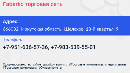 Faberlic, торговая сеть по адресу 666032, Иркутская область, Шелехов, 18-й квартал, 9 в дальнейшем Организация, размещена в следующих категориях: