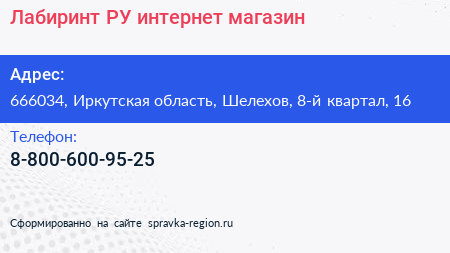 Лабиринт.РУ, интернет-магазин по адресу 666034, Иркутская область, Шелехов, 8-й квартал, 16 в дальнейшем Организация, размещена в следующих категориях: