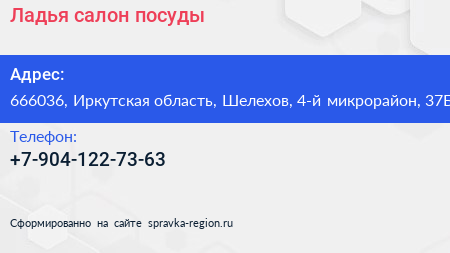 Ладья, салон посуды по адресу 666036, Иркутская область, Шелехов, 4-й микрорайон, 37Б в дальнейшем Организация, размещена в следующих категориях: